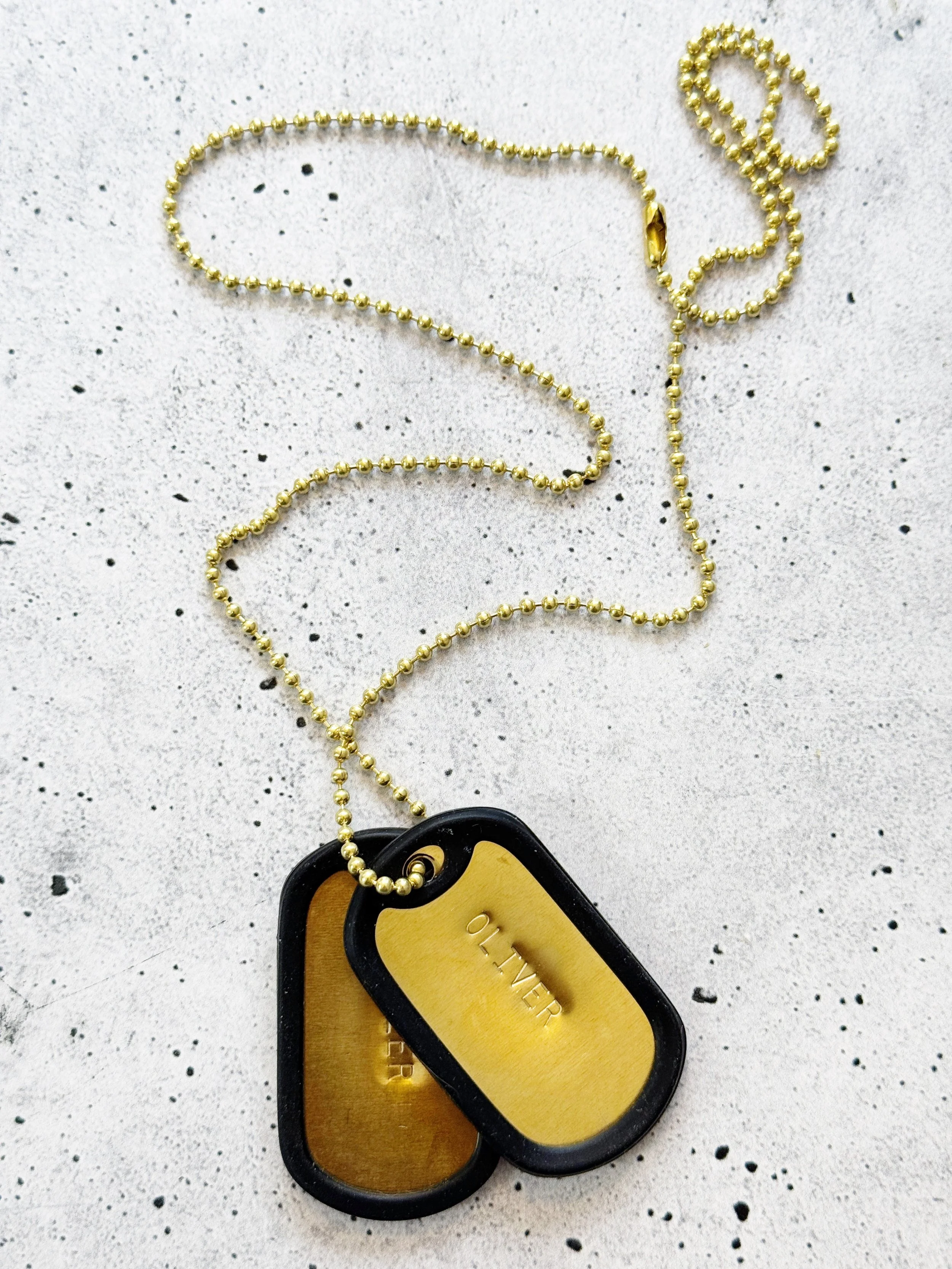 Vintage military-spec dog tags with rolled edges and genuine deadstock construction. Paired an 18K Gold Plated (Stainless Steel core) and 18k gold plated connector.