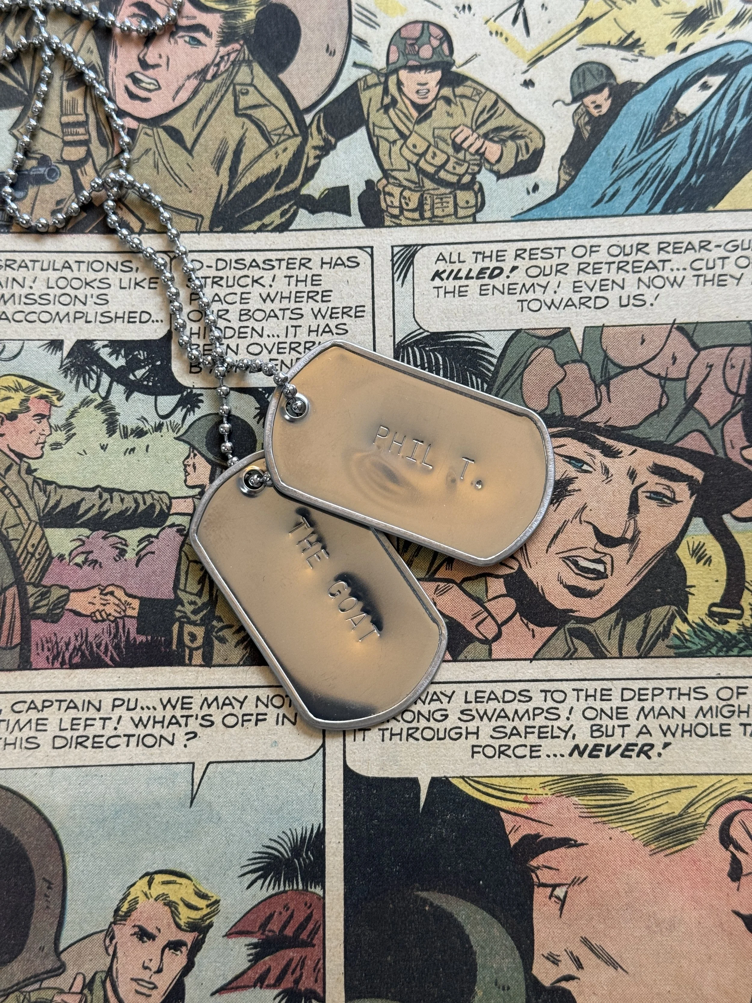 Philippe can almost always be found wearing dog tags. His inspiration for them traces back to the Vietnam War era — when military identification tags were standard issue for U.S. troops. At the same time- in the streets of Vietnam, local vendors also sold personalized tags, stamped with translations, bits of humor, or requests for whisky, beer, or smokes.